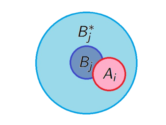 Hence \[{\color{red}A_i \subseteq B_j^{*}},\] where \(B_j^*\) is the ball concentric with \(B_j\) whose radius is three times that of \(B_j\). In other words, \({\color{red}B_j^*=3B_j}\).
