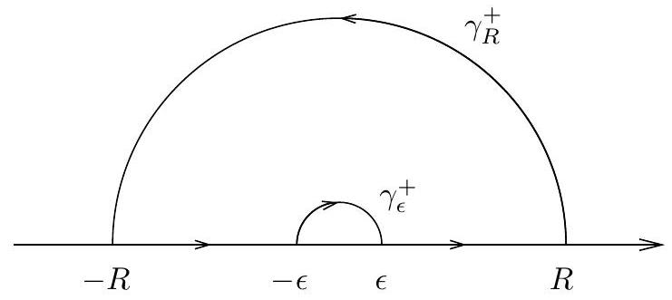 If we denote by \(\gamma_{\epsilon}^{+}\)and \(\gamma_{R}^{+}\)the semicircles of radii \(\epsilon\) and \(R\) with negative and positive orientations respectively, Cauchy’s theorem gives \[\int_{-R}^{-\epsilon} \frac{1-e^{i x}}{x^{2}} d x+\int_{\gamma_{\epsilon}^{+}} \frac{1-e^{i z}}{z^{2}} d z+\int_{\epsilon}^{R} \frac{1-e^{i x}}{x^{2}} d x+\int_{\gamma_{R}^{+}} \frac{1-e^{i z}}{z^{2}} d z=0\]