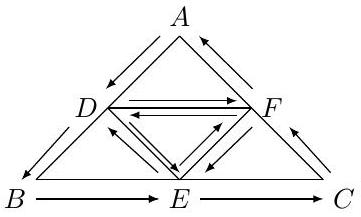 \[\begin{aligned} \triangle_{01}=\triangle(A,D,F),\quad \triangle_{02}&=\triangle(D, B, E), \quad \triangle_{03}=\triangle(F, E, C)\\ \triangle_{04}&=\triangle(E, F, D). \end{aligned}\]