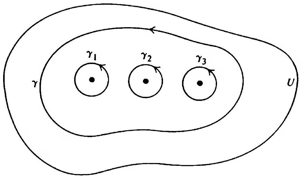 Let \(\gamma\) be the curve illustrated below, and let \(U\) be the plane from which three points \(z_{1}, z_{2}, z_{3}\) have been deleted. Let \(\gamma_{1}, \gamma_{2}, \gamma_{3}\) be small circles centered at \(z_{1}, z_{2}, z_{3}\) respectively, oriented counterclockwise.