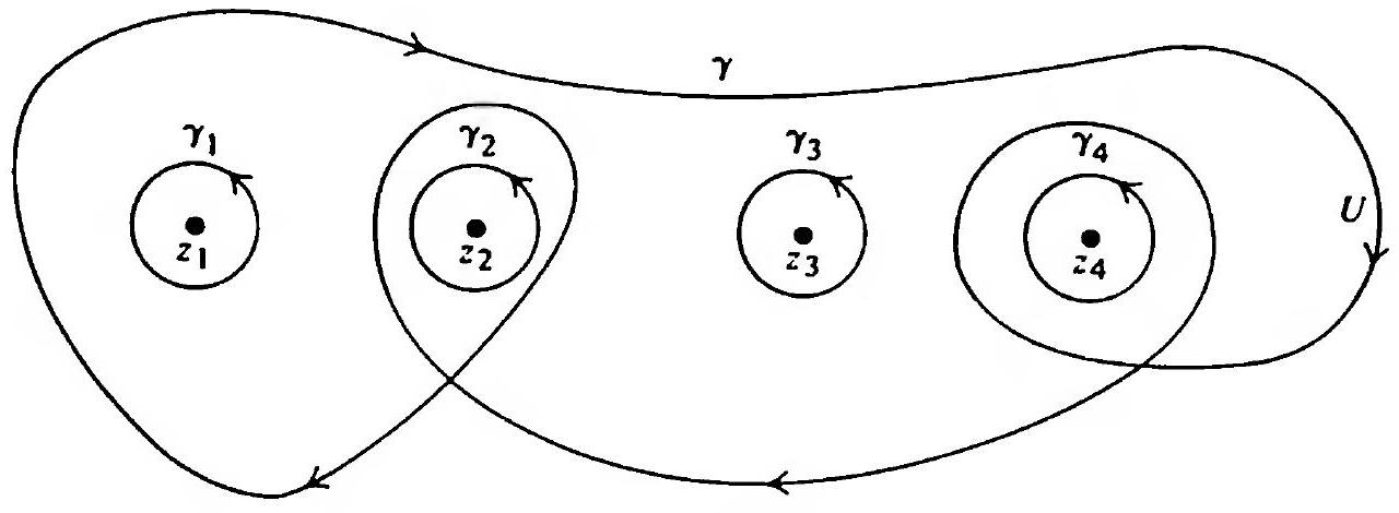 Let \(\gamma\) be the curve illustrated below, and let \(U\) be the plane from which four points \(z_{1}, z_{2}, z_{3}, z_4\) have been deleted. Let \(\gamma_{1}, \gamma_{2}, \gamma_{3}, \gamma_4\) be small circles centered at \(z_{1}, z_{2}, z_{3}, z_{4}\) respectively, oriented clockwise.
